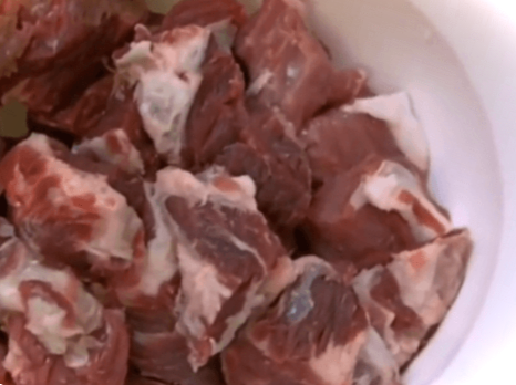 Нарізаємо м'ясо шматочками вагою 50-60 г., перекладаємо його поки що в глибоку страву.