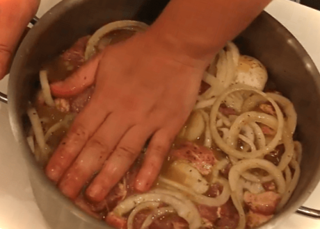 Потім усе ущільнюємо руками і прикриваємо кришкою каструлю і прибираємо свинину маринуватися в холодильник на 10-12 годин.