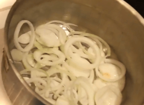 Нарізаємо півкільцями цибулю. Викладаємо шар цибулі на дно каструлі. Наступним шаром укладаємо м'ясо.