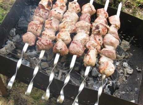 Вранці ми робимо вугілля в барбекю. Ми чекаємо, поки вугілля вигоріть і від них вийде гарна спека. Шматочки свинини на шампурі та викладіть на барбекю.