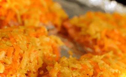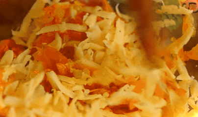 Потім до обсмаженої маси додаємо натертий на крупній тертці сир, перемішуємо.