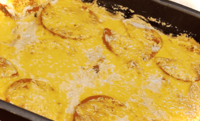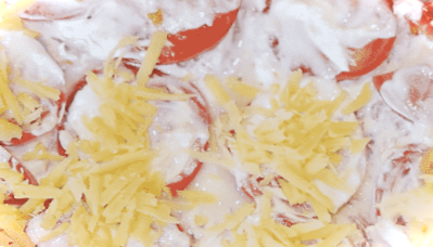 Томати нарізаємо кільцями, а сир натираємо на тертці. У цей час включаємо духовку на розігрів на 200ºС.