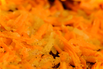 Потім нарізаємо цибулю півкільцями або пір'ям і злегка обсмажуємо на сковороді з невеликою кількістю олії. Коли цибуля стане прозорою і злегка підсмажиться, додаємо до неї натерту на крупній тертці моркву. Перемішуємо та смажимо разом кілька хвилин. Тут же овочеву масу солимо і перчимо.