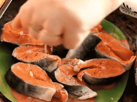 Горбушу моєму, чистим і нарізаємо стейками. Кладемо їх на тарілку, солимо, перчимо, а потім поливаємо соком з половинки лимона, щоб вона стала м'якшою. Залишаємо рибу на кілька хвилин, щоб вона замаринувалась.