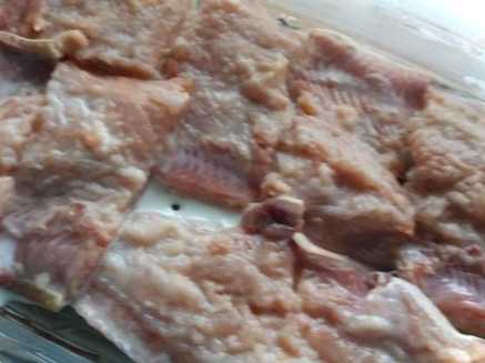 Спочатку займемося рибою. Її необхідно розпорошити, якщо вона у вас була непотрошена і з головою, і помити. Обрізаємо у неї хвіст і плавці, їх можна не викидати, з них можна зварити пізніше юшку. Далі робимо філе. Для цього підтягуємо гострий ніж біля основи хребта і, ковзаючи вздовж нього, відрізаємо м'ясо. Також чинимо і з іншого боку. Можуть залишатися на м'ясі реберні кістки, їх видаляємо руками. Філе розрізаємо на порційні шматки шириною 5-7 см.