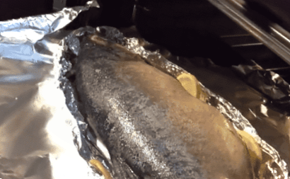 Ставимо запікатися в духовку, попередньо розігріту до максимуму. Час запікання -15-20 хвилин. У сильно розігрітій духовці білки м'яса швидко запікаються, залишаючи внутрішню соковиту частину. Частина молока може витекти, але це тільки піде на користь: риба одночасно гаситиметься. Приблизно за п'ять хвилин до закінчення приготування зменшіть температуру до 150-180ºС.