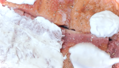 Готуємо сметанний соус. Для цього в баночку зі сметаною видавлюємо через прес часник, ретельно розмішуємо, щоб вийшла однорідна маса. Отриманим соусом змащуємо підготовлену рибу.