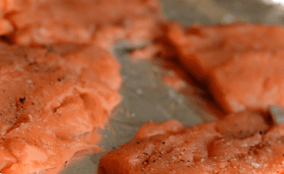 Деко застилаємо фольгою, і розкладаємо шматки горбуші. Рибу злегка солимо і посипаємо перцем.