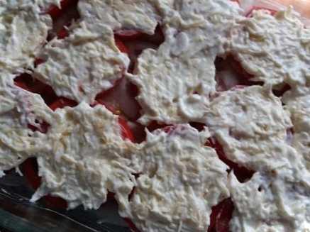 Зверху викладаємо кружечки помідорів, а зверху їх знову змащуємо сметанним кремом та присипаємо натертим сиром.