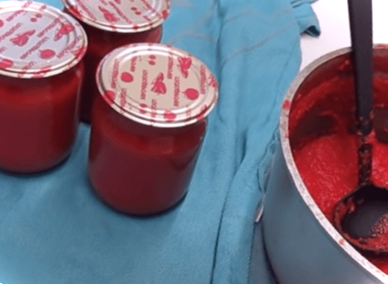 і відразу закочуємо. Банки перевертаємо, потім укутуємо і залишаємо так до повного остигання банок. Отримана томатна паста виходить дуже гарного кольору та практично така ж густа, як магазинна.