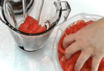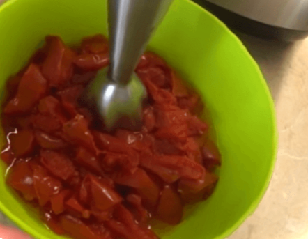 А помідори, що залишилися, перекладаємо в чашку і занурювальним блендером і перебиваємо в однорідне пюре.