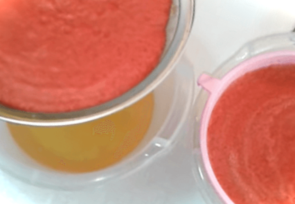 Рідина виходить майже прозорою, виливати її не потрібно, її можна просто випити, додати до борщу або зробити заливкою для консервування помідорів.Крок 4. Через 40 хвилин зібралося майже 4 л рідини. Пюре збираємо в одну каструлю. У ньому залишилося насіння. Якщо вони вас не влаштовують, то пюре можна перетерти через сито з маленькими дірочками або перебити блендером, тоді маса вийде одноріднішою. З цього моменту вогонь зменшуємо до маленького і при постійному помішуванні варимо ще 10-15 хвилин.