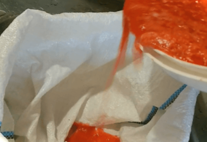 Подібний спосіб приготування заготівлі підійде, якщо вам потрібно переробити велику кількість помідорів і ви знаходитесь, наприклад, на дачі. У цьому випадку пропущені через м'ясорубку плоди помістіть у великий чистий мішок з-під цукру або борошна, зав'яжіть його та підвішуйте на дерево на кілька годин. Під мішком поставте таз, куди стікатиме з мішка сік, що утворився. У цей час можна зайнятися іншими справами чи просто відпочити. А якщо переробкою зайнялися в міській квартирі, тоді мішок з помідорною масою можна підвісити за ручки швабри, а кінці її покладіть на 2 табурети. Під мішком поставте ємність, куди стікатиме сік.