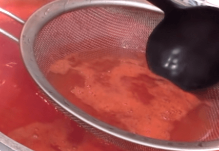 Крок 3. Ставимо каструлі на сильний вогонь і доводимо до кипіння. Як тільки почнеться кипіння, вогонь трохи зменшуємо і зверху на каструлю ставимо залізне сито з маленькими дірочками. І відразу можна побачити, як у ситі збирається рідина. Її потрібно акуратно ополоником або ложкою зібрати для того, щоб зменшити час варіння, а заготівля вийшла густою.
