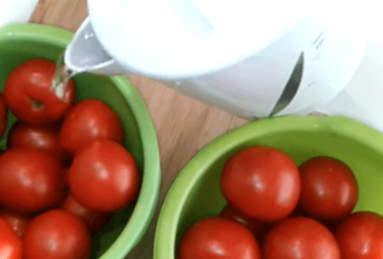 Крок 1. Стиглі томати розкладаємо по чашках і заливаємо їх окропом. Надрізи на плодах робити не треба, щоб не потрапила усередину зайва вода.