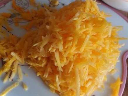 Гарбуз очищаємо від шкірки та насіння. Я, звичайно, рівно 300 г не відважувала. Якщо вона у вас велика, то відокремте четверту частину. У мене ж була 1 невелика, вірніше маленька гарбуз, її я і використовувала. Очищений овоч натираємо на великій тертці.
