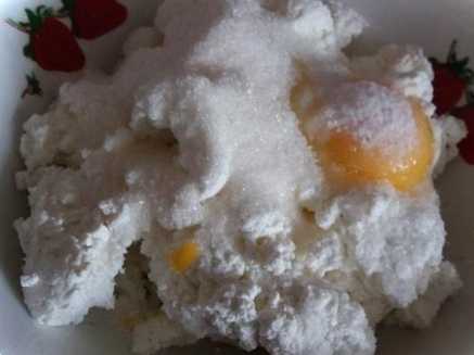 Сир перекладаємо в глибоке блюдо, додаємо 1 яйце, сіль, цукор, ванілін.