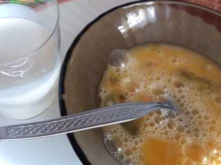 2 яйця розбиваємо в тарілку, додаємо щіпку солі та розмішуємо до однорідної маси. Потім туди додаємо вершки чи молоко.