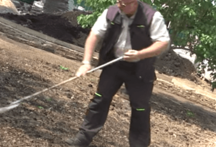 Наступним етапом буде розрівнювання ґрунту. Таким чином можна буде прибрати всі нерівності. Роблять це, розрівнюючи землю віяловими граблями, одночасно відступаючи назад. Таким чином ґрунт залишиться рівним без вм'ятин від ваших слідів.