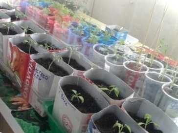 - Коробки - тетрапаки з-під соку, молока, кисломолочної продукції. Також відрізають верхню частину пакета, заповнюють нижню ґрунтом і засівають насінням. Маленькі пакети стануть у пригоді для огірків, високі - для перців, томатів.