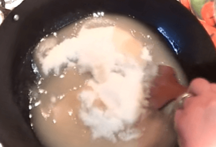 Починаємо з приготування цукрового сиропу. Для цього в каструлю або глибоку сковороду – «Вок» наливаємо склянку води, і туди додаємо спочатку 0,5 кг цукру. За допомогою дерев'яної лопатки розмішуємо цукор. Включаємо плиту на середній вогонь. Коли цукор трохи розчиниться, додаємо 1 кг цукру, що залишився. Знову добре перемішуємо, вогонь трохи зменшуємо і варимо сироп на повільному вогні, не забуваючи його періодично перемішувати і зіскребати зі стінок цукор, що залишився, інакше він закарамелізуется.