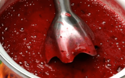 Вміст каструлю подрібнюємо блендером. Спочатку вмикаємо його на мінімальну швидкість, щоб бризки від соку не розлетілися по всій кімнаті. Закінчуємо на максимальній швидкості. Тим самим ми домагаємося одноріднішої структури ягідної маси.