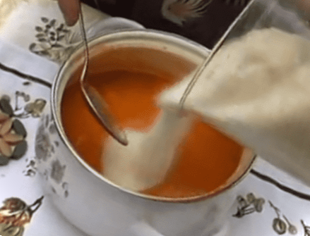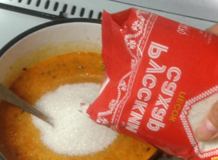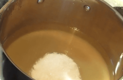 Далі ставимо каструлю на плиту та доводимо в ній воду до кипіння. У киплячу воду додаємо половину цукру, розмішуємо, щоб він розчинився.