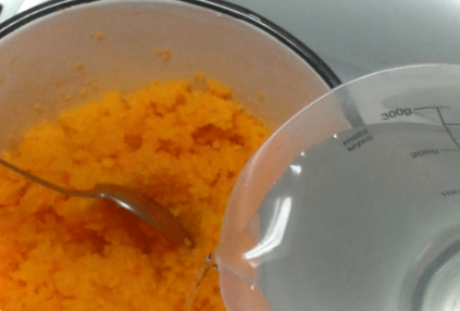 Перекладіть гарбуз у каструлю, додайте 1 склянку води і варіть на повільному вогні до одержання гарбузового пюре. Періодично помішуйте, щоб пюре не пригоріло на дно каструлі. Знімає пюре з вогню.