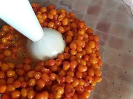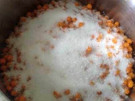 До отриманої ягідної маси додають цукор у співвідношенні 1:1, тобто на 1 кг подрібнених ягід додають 1 кг цукрового піску. Масу ретельно перемішують, щоб весь цукор розчинився. Потім готові ласощі з обліпихи перекладають у сухі простерилізовані баночки, закривають поліетиленовими кришками та зберігають у холодильнику.
