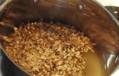 Висипаємо туди горіхи і варимо 20 хвилин на повільному вогні, періодично помішуючи масу.