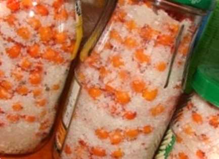Зацукрована обліпиха. Зберіть ягоди з гілок, промийте їх під проточною водою, обсушіть рушником. Перекладіть їх у чисті сухі банки, пошарово пересипаючи цукровим піском. Розрахунок такий: на 1 кг ягід беруть 1,3-1,5 цукру. Наповнені догори банки закривають кришками. Зберігають у холодильнику або в іншому прохолодному місці.