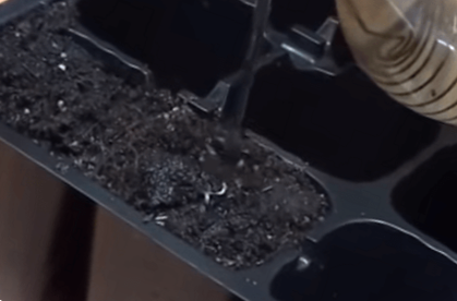Перед тим, як проводити посів, ґрунт у ємностях необхідно добре пролити. Це необхідно зробити обов'язково. Якщо ґрунт буде сухий, то посіяне насіння при подальшому поливі потрапить між грудочками ґрунту вглиб, і тоді схожість насіння буде мінімальною. Тому наповнивши ємності землею, полийте її добре пульверизатором.