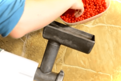 Потім через м'ясорубку пропускають спочатку калину. До речі, з отриманої маси можна зробити маску на обличчя, вона тонізує та омолоджує шкіру обличчя. Потім пропускаємо часточки апельсина в місці зі шкіркою.