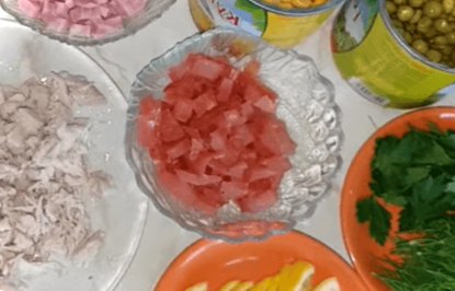 - Дрібними кубиками нарізаємо відварене куряче м'ясо, шинку, карпаччо;