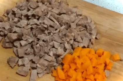 Поки язик гарячий, очищаємо його від шкірки, а потім нарізаємо дрібними шматочками. Так само нарізаємо моркву, яка варилася разом з ним у бульйоні.
