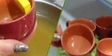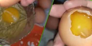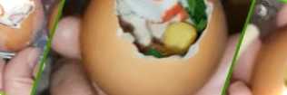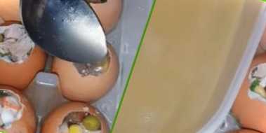 Столовою ложкою злегка розбиваємо яєчну шкаралупу з тупого кінця, так яйце буде стійко стояти на блюді. Обережно пальцями робимо невеликий отвір, через який виливаємо вміст яйця у банку. Шкаралупки добре промиваємо зовні та всередині, перевертаємо в контейнері для яєць, щоб із них стекла вода. Самі контейнери теж слід промити, інакше через нього можна заразитися сальмонельозом.