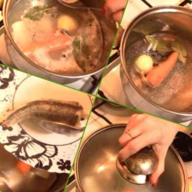 Точний час, коли буде готова риба, сказати важко. Це залежить який сорт риби використовується та якого вона розміру.Коли риба звариться, дістаємо її з бульйону. А сам бульйон пробуємо на сіль, можливо, його потрібно підсолити.