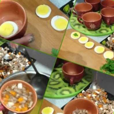 Листя петрушки укладаємо на скибочку яйця і, акуратно по центру, укладаємо його в чашку. Потім нагору накладаємо суміш з м'яса, моркви та білка яйця, наливаємо бульйон у чашку догори. Залишається тільки заливне прибрати в холодильник щонайменше на 5 годин, щоб воно застигло.