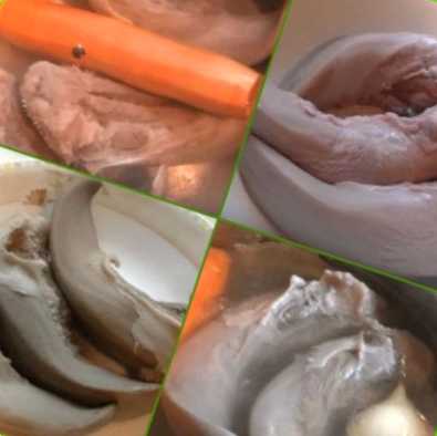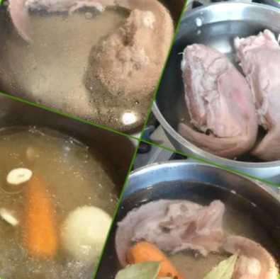 Незважаючи на те, що знімали піну, бульйон все одно залишився каламутним. Тому цю першу воду зливаємо, язики промиваємо від залишків сукровиці. Знову заливаємо язики чистою водою, додаємо морквину, солимо і ставимо варити під закритою кришкою до готовності.