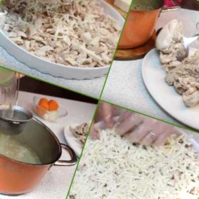 Розбираємо курку від кісток. М'ясо розрізаємо на дрібні шматочки і складаємо у форму, в якій готуватимемо заливне. Туди ж додаємо подрібнений часник, а над блюдом на тертці натираємо плавлені сирки. Натерті сирки рівномірно розподіляємо по поверхні.