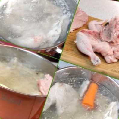 Складаємо частини курки, крім грудки, в каструлю, наливаємо холодну воду і ставимо на вогонь. Води наливаємо небагато, щоб вона лише покрила повністю м'ясо. Доводимо до кипіння, знімаємо піну, що утворилася.