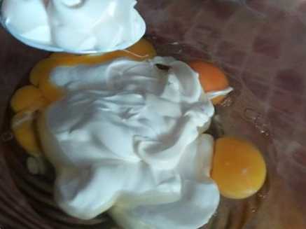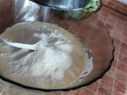 Потім до сметано-яєчної маси додаємо борошно, що просіює. Одночасно з борошном додаємо розпушувач і перемішуємо в однорідну масу. Тісто по консистенції має трохи густіше, ніж на оладки.