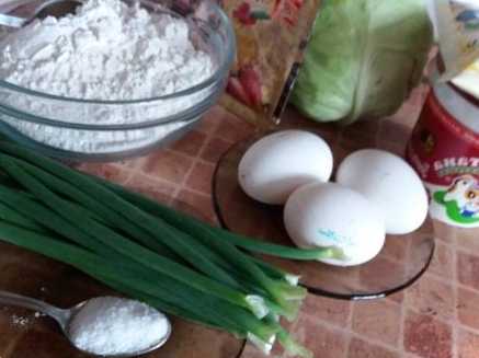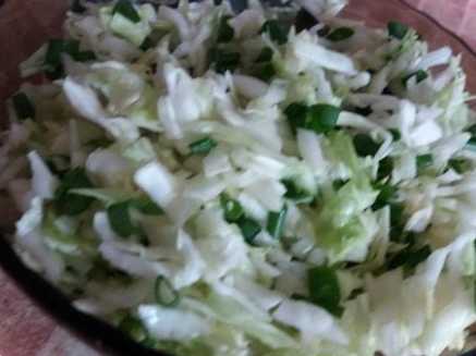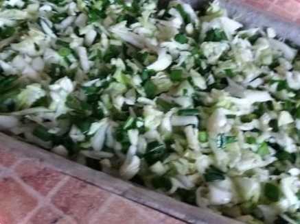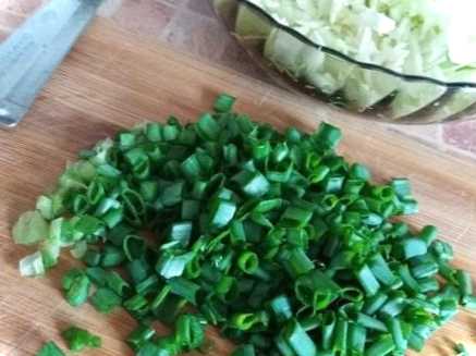Приготуйте для начинки половинку качана (приблизно 500 г), пучок зеленої цибулі чи петрушки, шепіт солі;