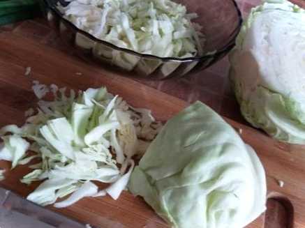 Капусту треба дрібно нашаткувати, трохи її присолити і пам'ятайте, щоб вона стала м'якою і трохи вологою. Здоров'я м'яти не потрібно, інакше вона пустить сік, а нам цього не треба.