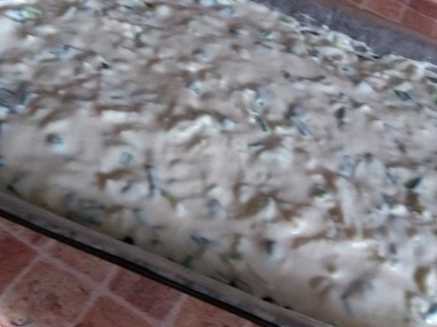 Наступний етап – формування нашого пирога. Форму для випічки або невелике деко змащуємо олією. Перший шар – тісто. Виливаємо у форму його трохи більше половини, розрівнюємо.