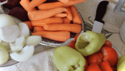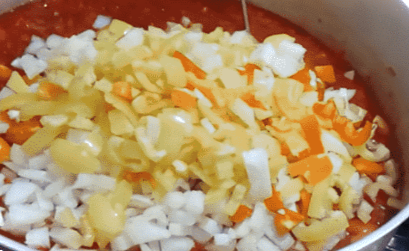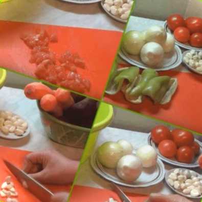 - Солодкий перець, цибуля, помідори нарізаємо дрібними шматочками і складаємо їх у велику ємність, де потім змішуватимемо всі інгредієнти.