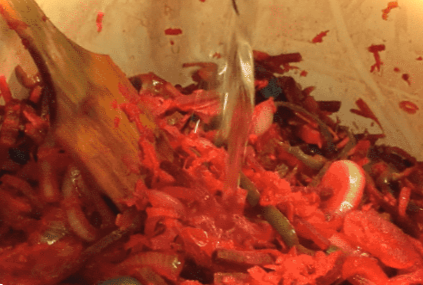 - Додаємо оцет, перемішуємо. Після додавання оцту буряк не змінює свій колір, він після теплової обробки стає таким самим яскравим і насиченим. Наприкінці приготування додаємо залишки оцту, перемішуємо. Даємо закипіти масі.