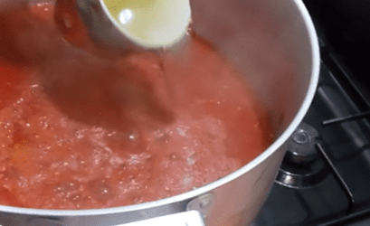 Пропускаємо помідори через м'ясорубку. Помідорну масу переливаємо у велику каструлю, ставимо на вогонь та чекаємо, коли вона почне закипати.