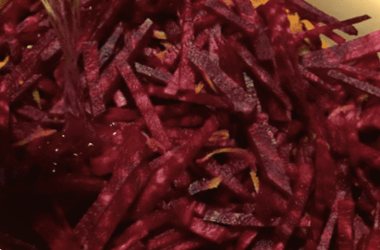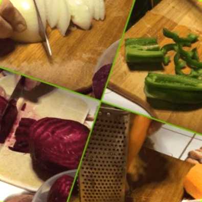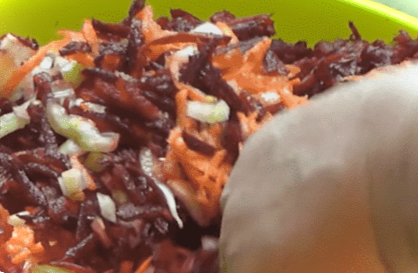 - На великій тертці трьом буряк і морква, відправляємо туди ж, у таз.
