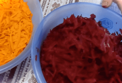 - Буряк і моркву очищаємо, шаткуємо їх окремо на великій тертці.